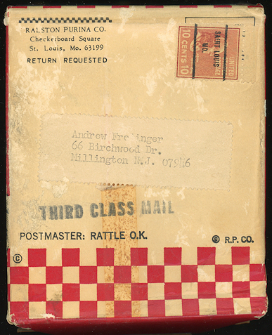 The only possible third class postage on this empty box that would equal exactly ten cents would be for five ounces at four cents for the first two ounces plus two cents per ounce for the next three. This rate schedule did not come into being until January 7, 1963, lasting exactly five years. Ten cent Prexies had not been delivered since 1958.