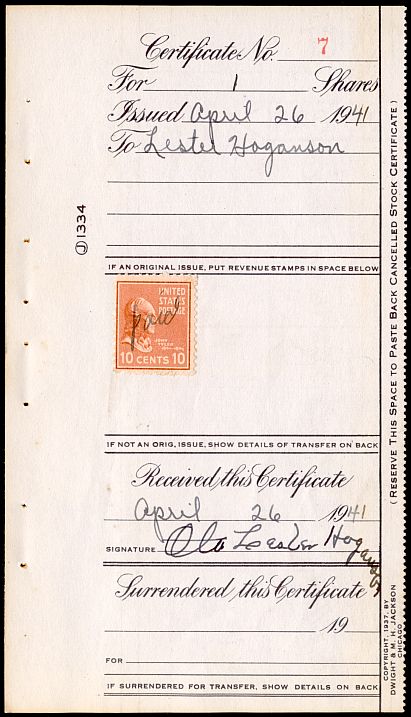 This is an illegal use of a ten-cent Prexie to pay the stock transfer fee for one share of stock in 1941.