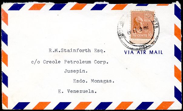 This cover was sent to Venezuela in 1957.