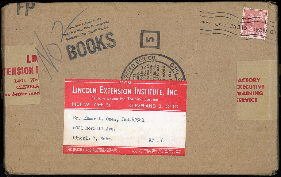 This parcel, weighing less than one pound, was sent at the fourth class book rate sometime in the early 1950's. Since it included additional third class material, two cents postage was added for that.