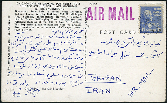Some stocks of eleven-cent Prexies were still available for use as late as 1964. One was used on this airmail postcard to Iran.