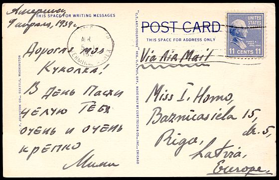 Just as there was no separate rate for international airmail postcards until 1954, there did not seem to be a separate rate for postcards sent internationally by air-surface-air. This example is one of several in my possession that were sent to Latvia at the eleven-cent rate in 1939, although the others do not use a solo eleven-cent Prexie.
