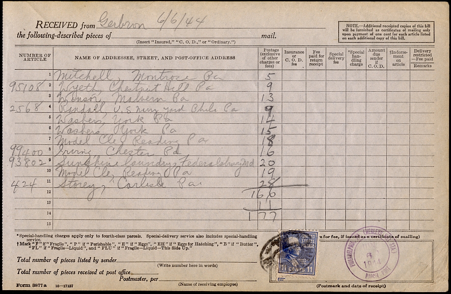 A certificate of mailing cost one cent per item from July 1, 1929 until February 1, 1954. Mailing books could serve as certificates for multiple mailings. This page is a shipping receipt for eleven pieces of mail.