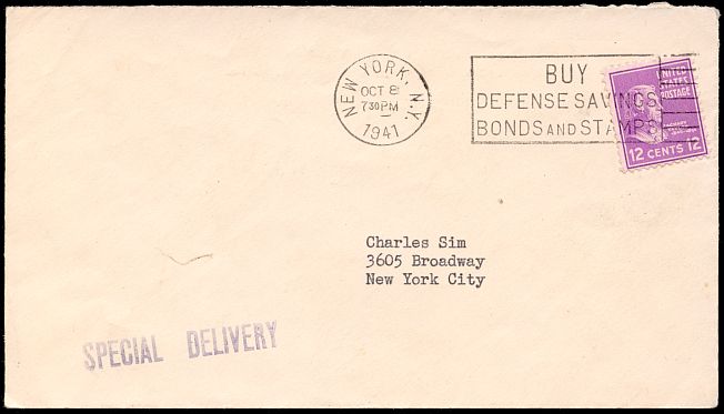 This special delivery letter was sent within New York City in October of 1941.