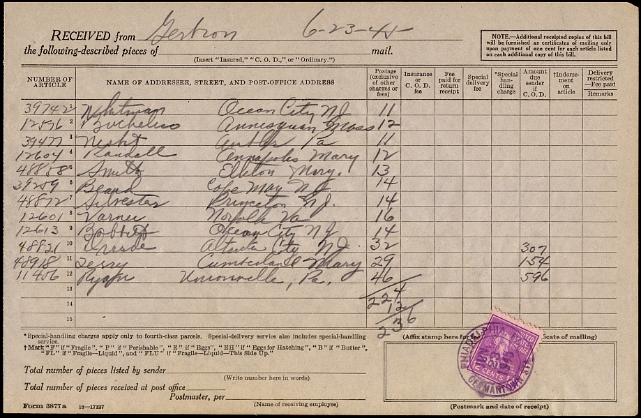 A certificate of mailing cost one cent per item from July 1, 1929 until February 1, 1954. Mailing books could serve as certificates for multiple mailings. This page is a shipping receipt for twelve pieces of mail.