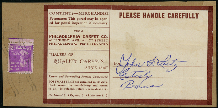 This fragment of a package was sent to zone 1, but the twelve cent rate could cover postage in several periods. From 1938 to March 26, 1944 for four to five pounds the postage would have been eight cents for the first pound and three times 1.1 cents, rounded up. From March 26, 1944 to January 1, 1949 twelve cents would have covered only three to four pounds, as there was a one cent minimum surcharge in effect. And between January 1, 1949 and October 1, 1951, twelve cents was the zone 1 rate for one pound.