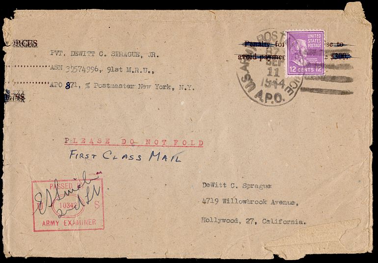 Armed forces personnel and certain others serving outside the continental United States could send first class letters and postcards free to anyone in the U.S. or territories and possessions from April 1, 1942 through the end of 1947. This 1944 cover from a serviceman in Scotland is more of a package than a letter, so apparently was charged domestic first class postage for four ounces.