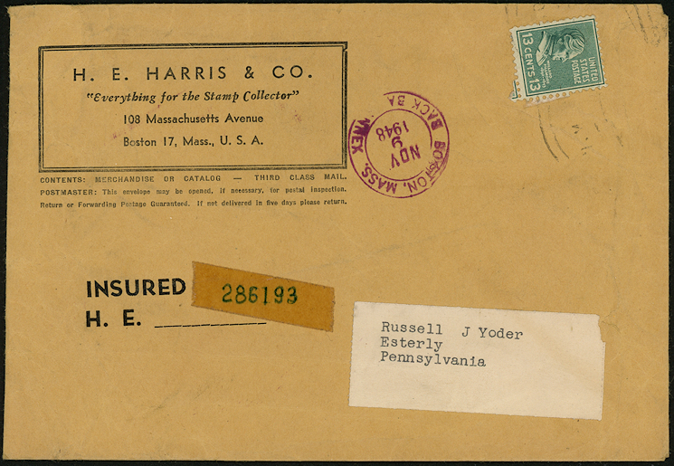 If third class, postage would have come to three cents for a two-to-four ounce package, and insurance would have been ten cents for indemnity from $5.01 to $25. If fourth class, local, the package would have weighed from three to five pounds for nine cents postage, plus a one-cent surcharge and three cents for indemnity of $5 or less. If treated as first or second zone parcel post it would have weighed one to two pounds and been one cent overpaid - unlikely use of a thirteen cent stamp, I would think.