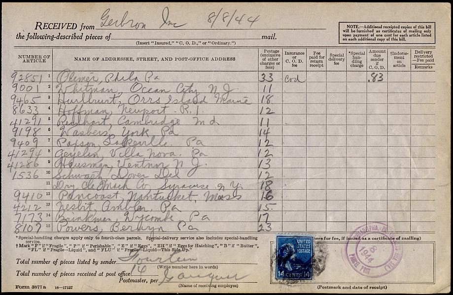 A certificate of mailing cost one cent per item from July 1, 1929 until February 1, 1954. Mailing books could serve as certificates for multiple mailings. This page is a shipping receipt for fourteen pieces of mail.