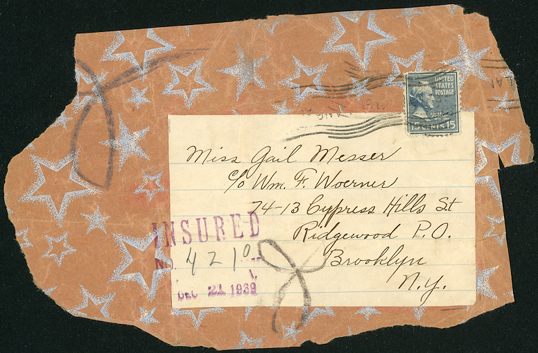 This portion of a wrapper cannot be dated and its weight cannot be determined, so it could have been sent at various times. Prior to March 26, 1944 it would have weighed seven pounds, between March 26, 1944 and January1, 1949 the one cent surcharge would have meant that the weight would have been six pounds, and mailed from January 1, 1949 to October 1951 the weight woud have been only two pounds.