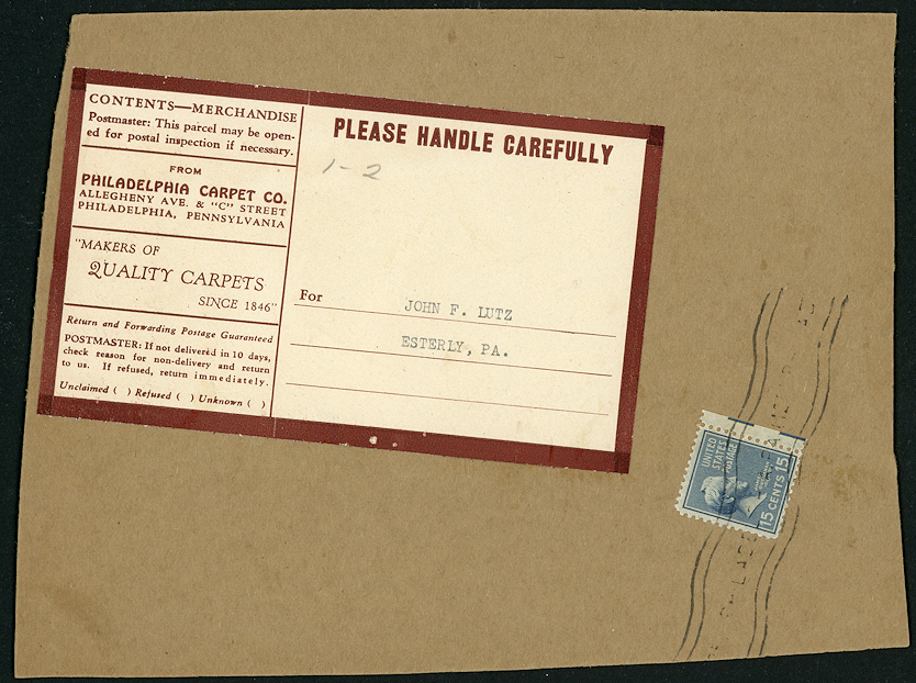A number of fifteen-cent fourth class first pound rates were possible during the Prexie period, depending on the time sent and the zone. There was also a fifteen-cent COD one-pound book parcel rate from July 1, 1942 to March 25, 1944.