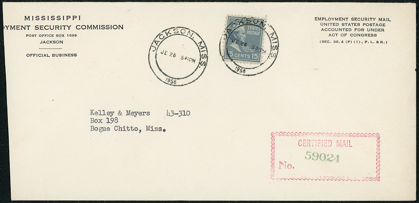 The certified mail fee was fifteen cents from June 7, 1955 to July 1, 1957. The fifteen cent Liberty was not issued until 1958.