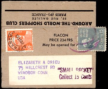 Small packets were also subject to fees for customs clearance and delivery at the receiving end. These were ten cents for customs and five cents for delivery from July 1, 1930 until May 15, 1957. The item illustrated bears a fifteen-cent Prexie to pay these fees. Normally, a postage due stamp would have been used.
