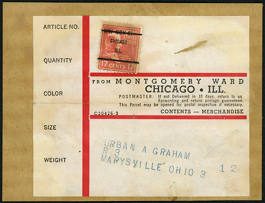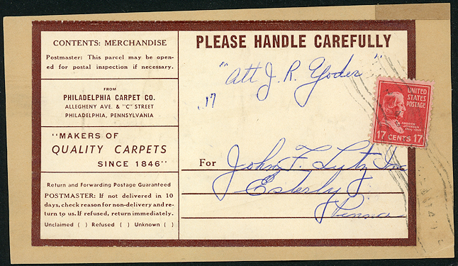 This laundry tag was mailed between October 27, 1938 (when the seventeen-cent Prexie was first available) and January 1, 1949. This interval spans the time when there was a three-cent discount for mailing a package on a rural route for delivery to zones1-8, and the back of the tag, which bears fourteen cents in postage, is stamped "Mailed on rural route."