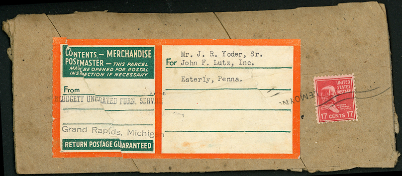 A fragment of a parcel wrapping sent to zone 1. Not knowing the time it was sent nor the weight, it coud have been sent either before March 26, 1944, when it would have weighed between eight and nine pounds (eight cents for the fist pound and 1.1 cents for each of the next eight) or after, up until January 1, 1949, for seven to eight pounds since there was a one cent surcharge.