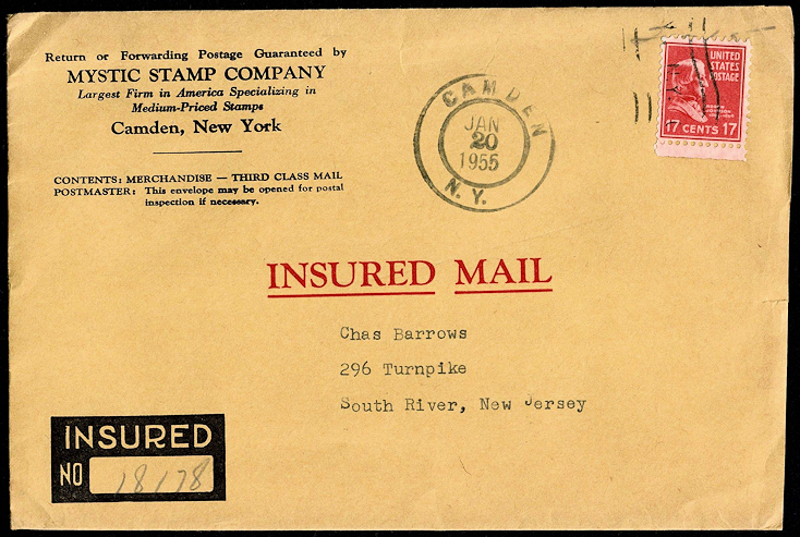 This insured cover was sent in 1956. It is not likely that it weighed six to seven ounces, but it would have been insured for $5.01 to $10.00 if that had been the case. More likely it weighed two ounces or less and was insured for $10.01 to $25.00.