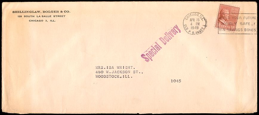 This special delivery letter was sent from Chicago to Woodstock, Illinois in 1949.