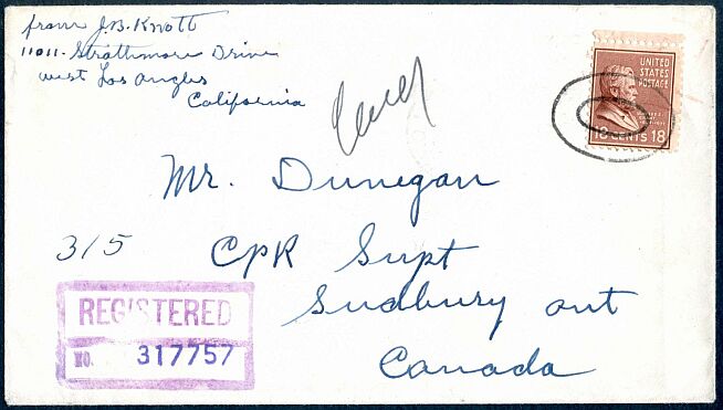 This registered cover was sent from Los Angeles to Sudbury, Ontario in 1939.