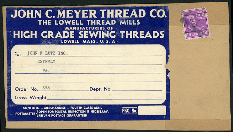 This portion of a package mailed from Massachusetts to Pennsylvania falls into zone 4. The only rates which work out are those for a two pound package mailed January 1, 1949 to October 1, 1951: fourteen cents for the first pound and 4.5 centsfor the second, rounded up.