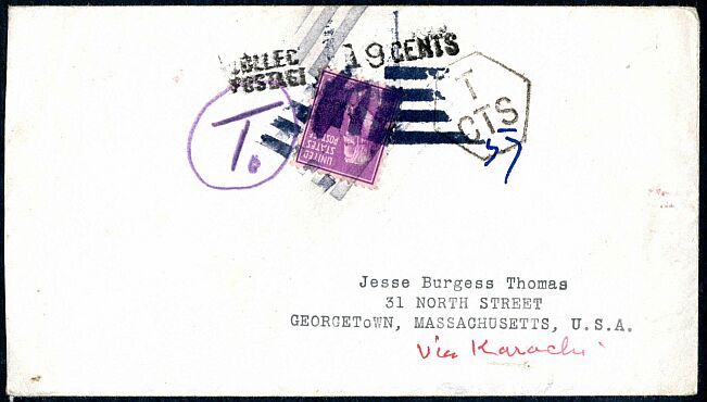 This is one of the most unusual possible uses for a nineteen-cent Prexie. Assuming the cover is not a fabrication, the stamp served to collect postage due on a letter mailed from Central Asia without postage. The "57" in manuscript below the rightmost "T" would translate to nineteen cents if at the time one cent was equal to three centimes.