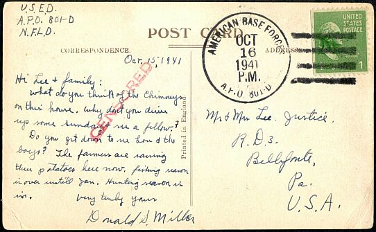 A one-cent stamp from a booklet pane was used on this postcard from a member of our Base Forces in Newfoundland prior to our entry into World War II.