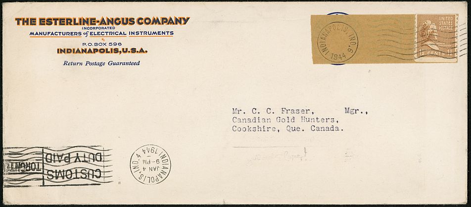 Printed matter sent to Canada in 1944 using a one-and-one-half-cent horizontal coil stamp. The printed matter rate in our postal treaty with Canada was one-and-one-half cents per two ounces from April 1, 1932 until November 1, 1953.
