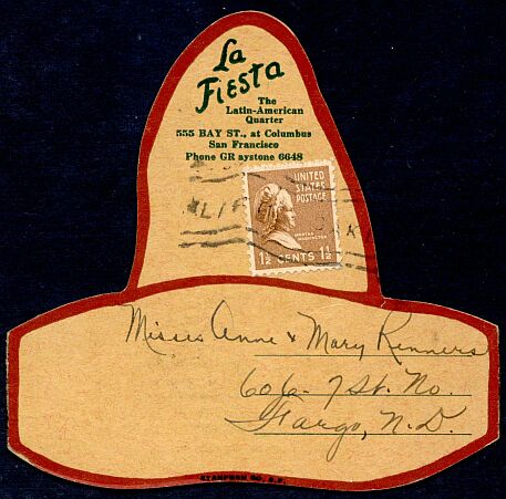 A one-and-one-half-cent sheet stamp used to mail a bar menu. The third class printed circular and miscellaneous matter rate was one-and-one-half cents per two ounces from March 15, 1925 until January 1, 1949.