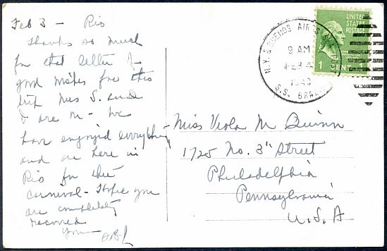 This postcard was sent from the S.S. Brazil, N.Y. & Buenos Aires Sea Post in 1940. The domestic postcard rate was applied, as it was posted on a U.S. ship and sent to the U.S.