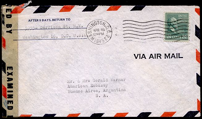 Airmail to Argentina cost twenty cents for the first half-ounce from April 1, 1945 until November 1, 1946.