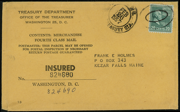 This insured fourth-class label has a notation of 17 plus 3 adding to 20, where presumably the 3 is for the three-cent minimum insurance fee in effect from November 1, 1944 to January 1, 1949. Wilbur Visual Services was likely to have been mailing film rather than books, and there is no indication that either the library or book rate were being used. Film was not covered by either of the special rates until 1953, so regular parcel post rates would have applied.