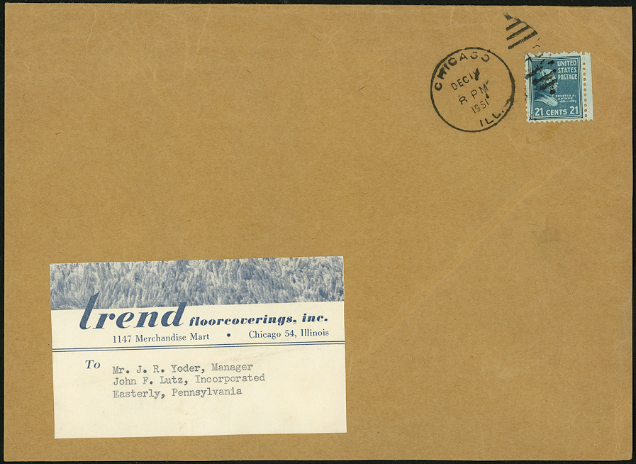 A portion of a package sent from Chicago to Esterly (not Easterly, as shown in the address,) Pennsylvania in December of 1951. This is a zone 5 mailing, though with a dated cancel it could possibly be seven times first class. However, as parcel post the contents would have weighed up to a pound, as the zone 5 first pound rate was twenty-one cents from October 1, 1951 to October 1, 1953.