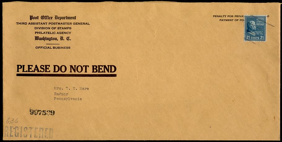This registered penalty cover was sent by the Post Office Department in January of 1941. Since it was sent from Washington, D.C., no postage or registration fee would have been payable if it had been classed as official business. Since it apparently was not in that category, both would have been collected.