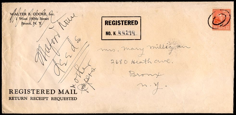 This cover was sent locally at a carrier post office, double weight, registered with return receipt requested. The charges break down to four cents postage, fifteen cents minimum registry and three cents for the return receipt.
