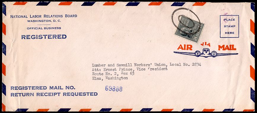 This airmail letter was sent from the National Labor Relations Board registered, return receipt requested, in 1940.