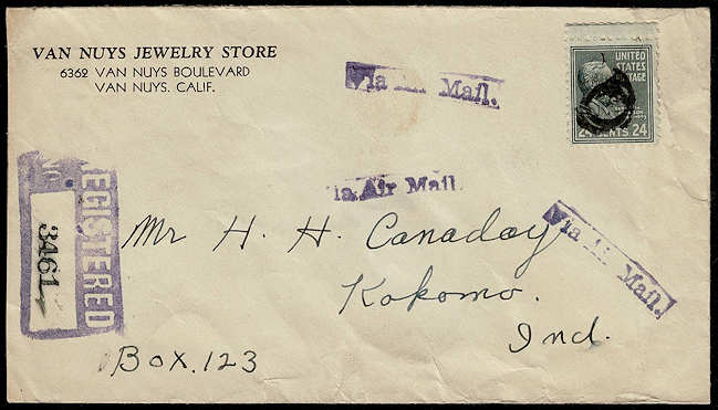 This letter was sent airmail by a jewelry store in 1942. It is easy to believe that it was registered for a declared value between $5 and $25.