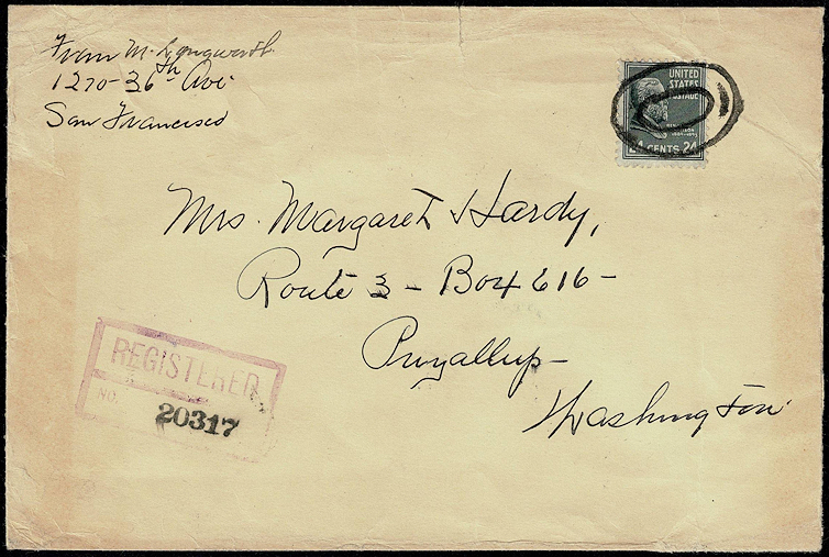 Contents of this wrapper mailed in 1943 may have weighed between two and three ounces to require nine cents postage to go with a registry fee of fifteen cents, or could have weighed between one and two ounces for six cents postage combined with second step registry of eighteen cents.