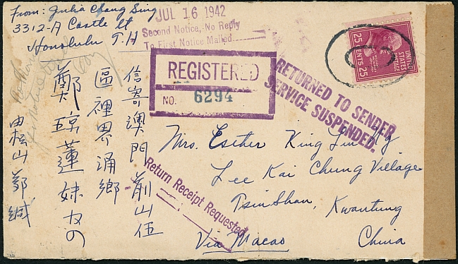 This cover was sent registered, return receipt requested, surface rate to China in December of 1941. It did not reach the addressee.