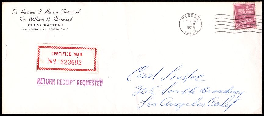 A certified letter with return receipt requested cost twenty-five cents from June 6, 1955 until July 1, 1957. This breaks down as three cents for postage, fifteen cents registry fee and seven cents for the return receipt.