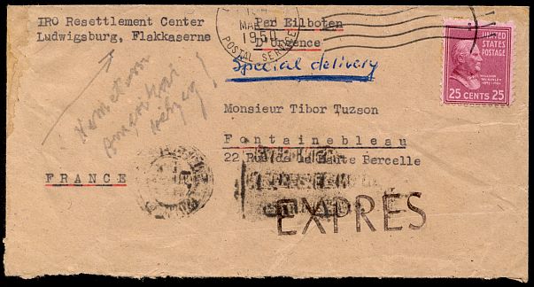 This cover was sent special delivery from a branch of the International Refugee Organization in Ludwigsburg through the United States APO system in 1950, thus costing five cent postage plus twenty cents for special delivery. The IRO was a non-permanent Specialised Agency of the United Nations, founded July 1, 1947 and closed on February 28, 1952.