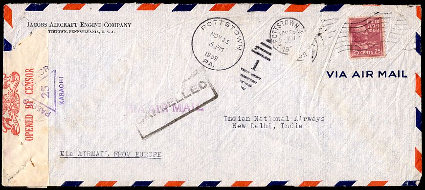 From January 1, 1939 until June 14, 1940 the cost to send a letter by surface to Europe and on to India and within India by air was twenty-five cents, a combination of the five cent surface rate and a twenty-cent per half ounce surcharge for air service..