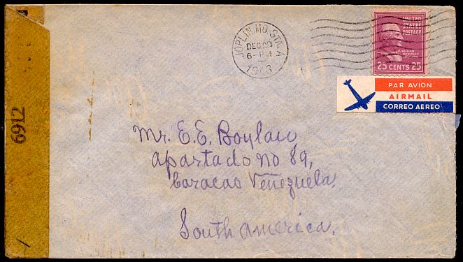 The airmail rate to Venezuela was twenty-five cents from June 22, 1938 until April 1, 1945.