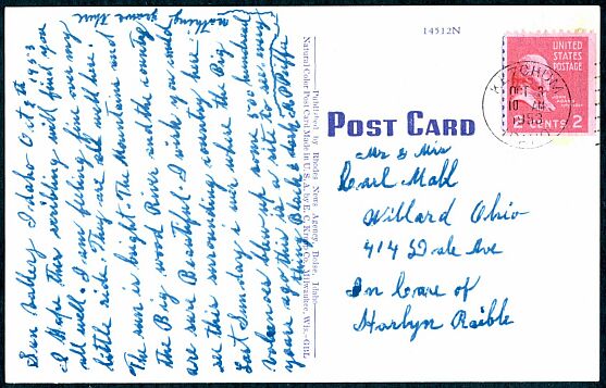 A two-cent stamp from a booklet pane used on a domestic postcard in 1953. The domestic post card rate was two cents from January 1, 1952 until July 31, 1958.