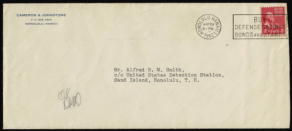 Sand Island Detention Station was considered to be part of Honolulu, at least so far as the Post Office was concerned. This letter was sent at the drop rate to Alfred Smith, a noted German sympathizer who was detained in various locations for the first part of the Second World War.