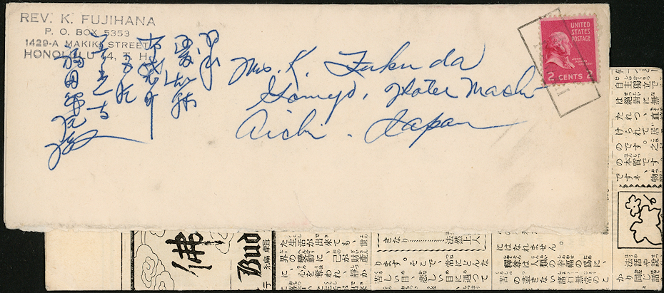 The international printed matter rate applied to material sent from territories and possessions as well. This newsletter of The Hawaii Buddhism was sent from Hawaii to Japan in 1954.