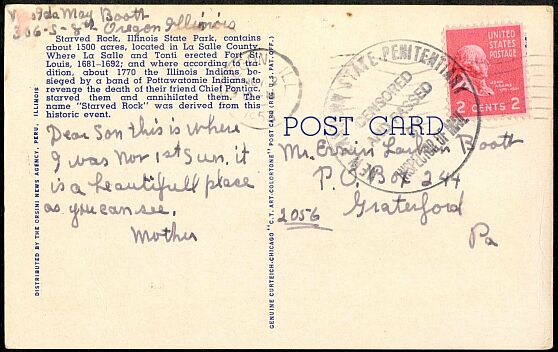 The two-cent sheet stamp used on a domestic post card censored by a state penitentiary. The domestic post card rate was two cents from January 1, 1952 until July 31, 1958.