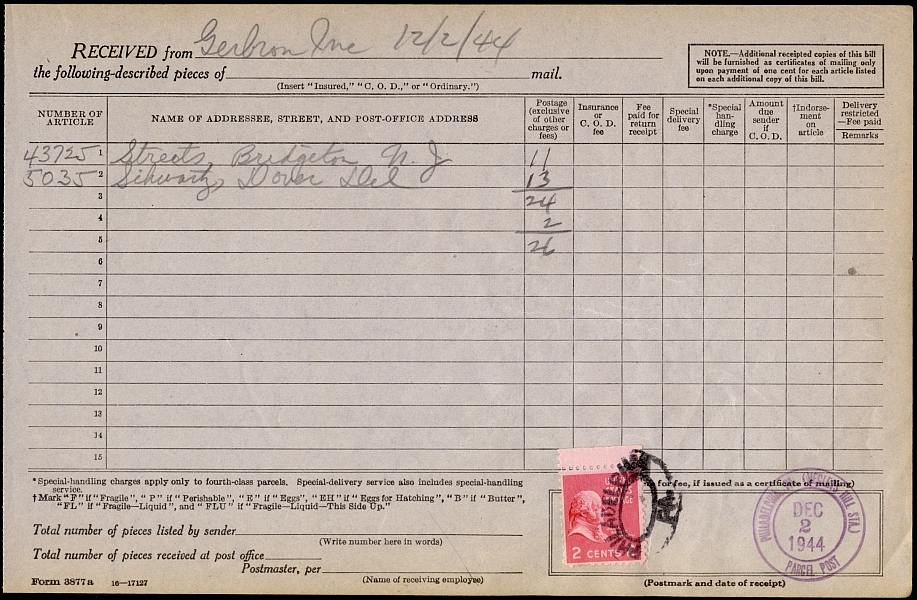 A certificate of mailing cost one cent per item from July 1, 1929 until February 1, 1954. This page is a shipping receipt for two pieces of mail.