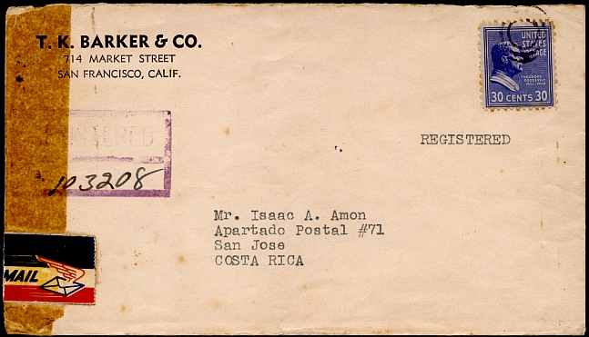 This cover was sent registered airmail from San Francisco to Costa Rica via Brownsville, Texas, on July 19, 1943.