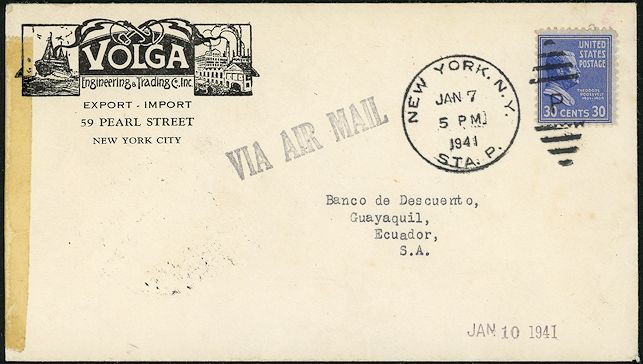 This cover was sent from New York to Ecuador by air in 1941.