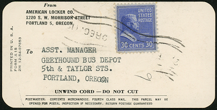 A tag sent local fourth class within Portland, Oregon. It was used sometime in the 1950's, judging from a 54 as part of the form number. Also, the most logical breakdown of the rate is eighteen cents for the first pound and eight more pounds at 1.45 cents each for 29.6 cents, rounded up. This is the rate effective from October 1, 1953 to February 1, 1960.