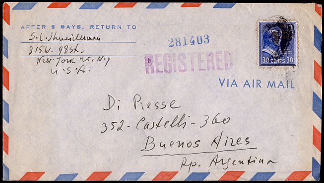 This cover was sent registered to Argentina on August 11, 1947.